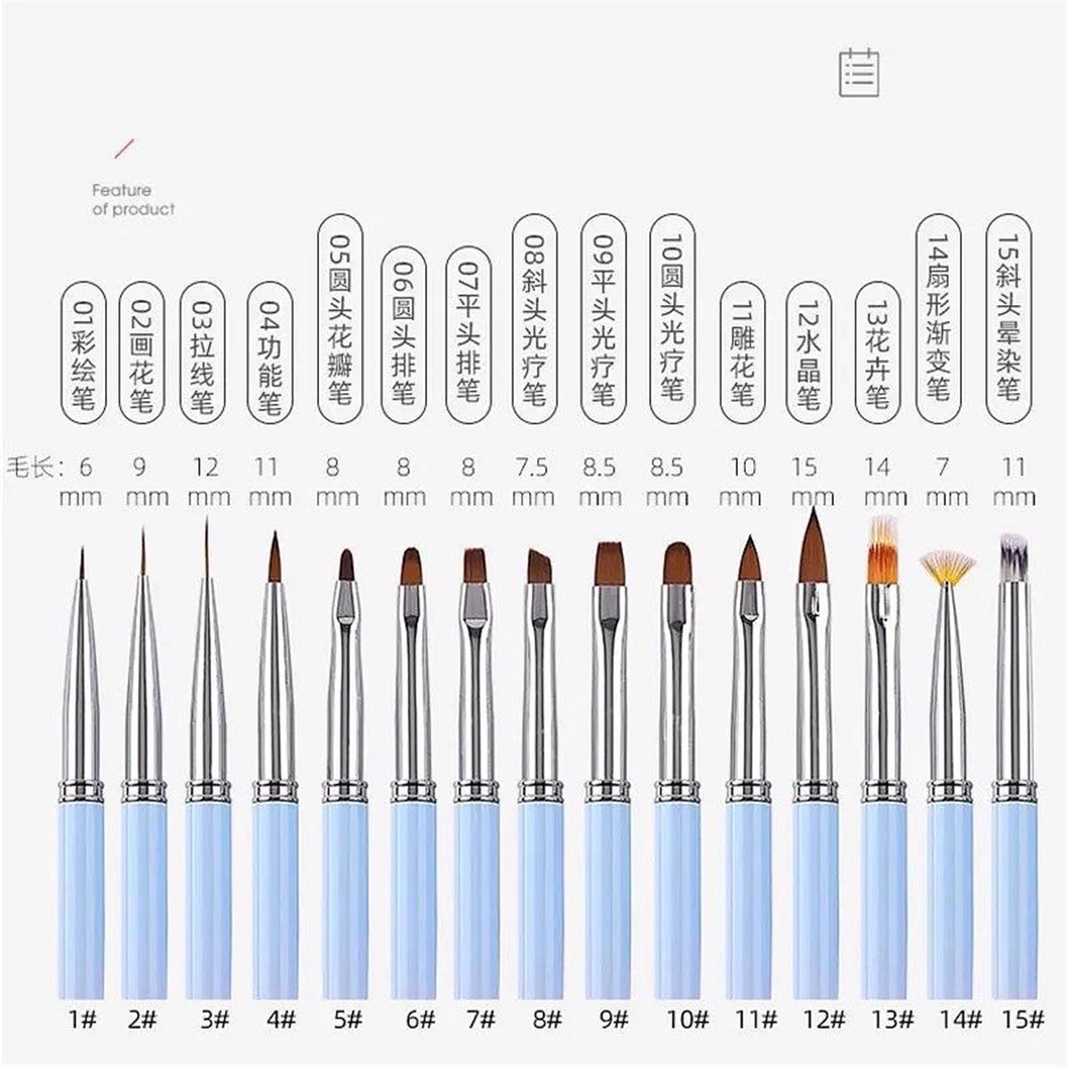 Nail art ve jel uygulamaları için 15 farklı uç seçeneği sunan profesyonel fırça seti. İnce çizim fırçaları, jel sürme fırçaları ve detay fırçaları ile her türlü tasarımı gerçekleştirmenize olanak tanır. Kaliteli kıl yapısı dökülme yapmaz, kolay temizlenir. Uzmanların tüm ihtiyaçlarını tek pakette karşılar.