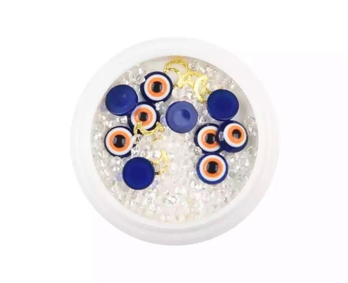Ellea Nail Beyaz Nazar Boncuklu Süsleme Taş Seti. Geleneksel nazar boncuğu figürlerini modern nail art ile buluşturan özel tasarım seti. Beyaz zeminli detayları ile her renk oje üzerinde dikkat çeker. Tırnak süslemede farklılık arayanlar için yüksek kaliteli ve kolay uygulanan dekoratif taşlar.