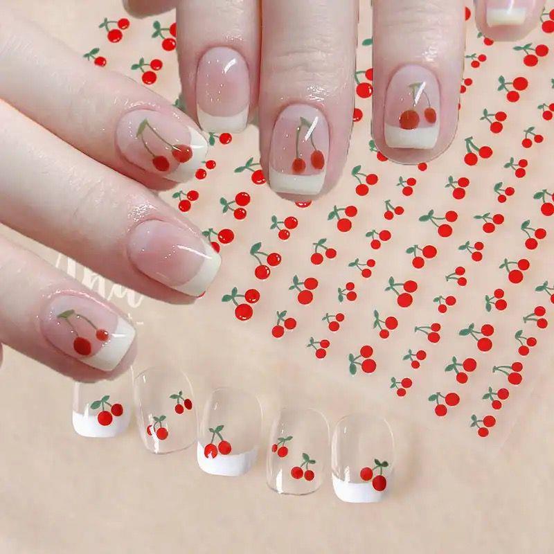 Tırnaklarınıza enerjik ve tatlı bir hava katan kırmızı kiraz desenli sticker. Meyve temalı yaz manikürleri için vazgeçilmezdir. İnce yapısı tırnakla bütünleşir, yapay durmaz. Hem şeffaf hem de renkli ojeler üzerinde şık ve dikkat çekici durur.