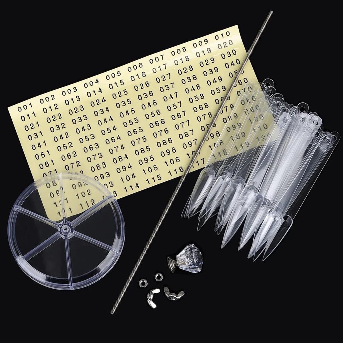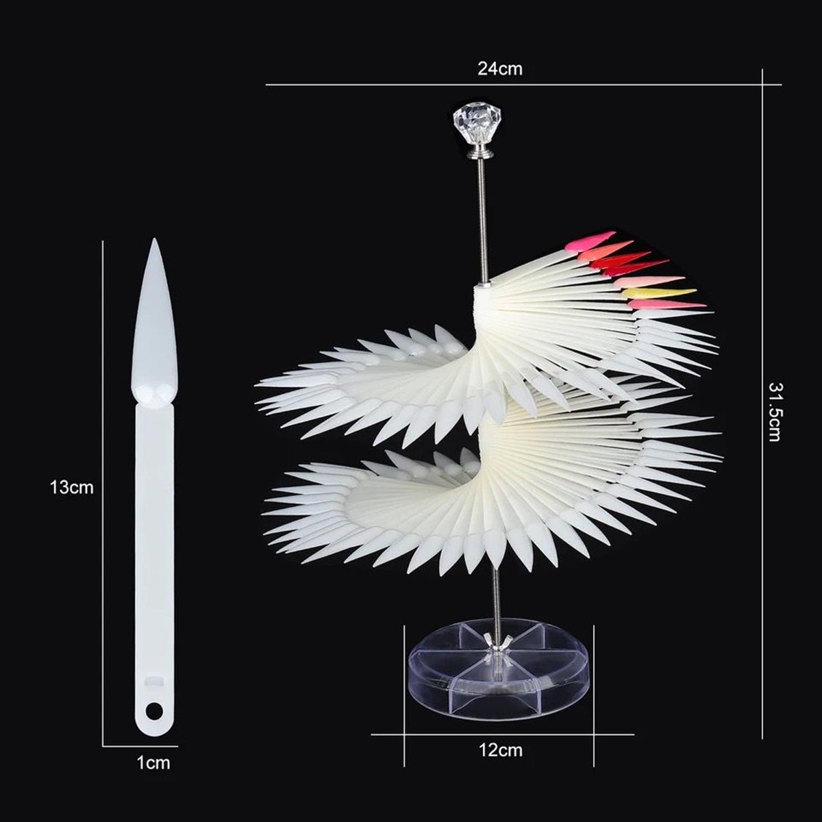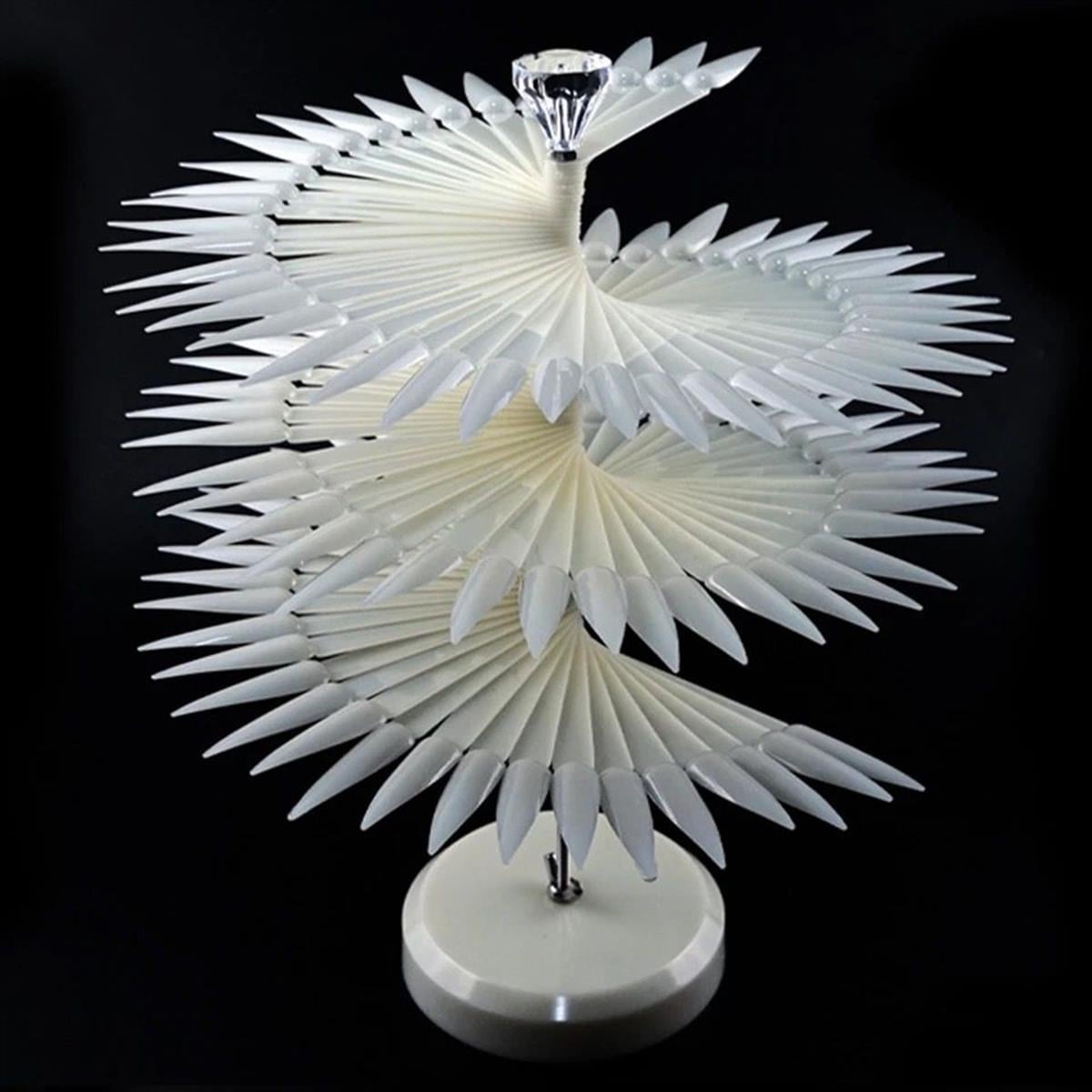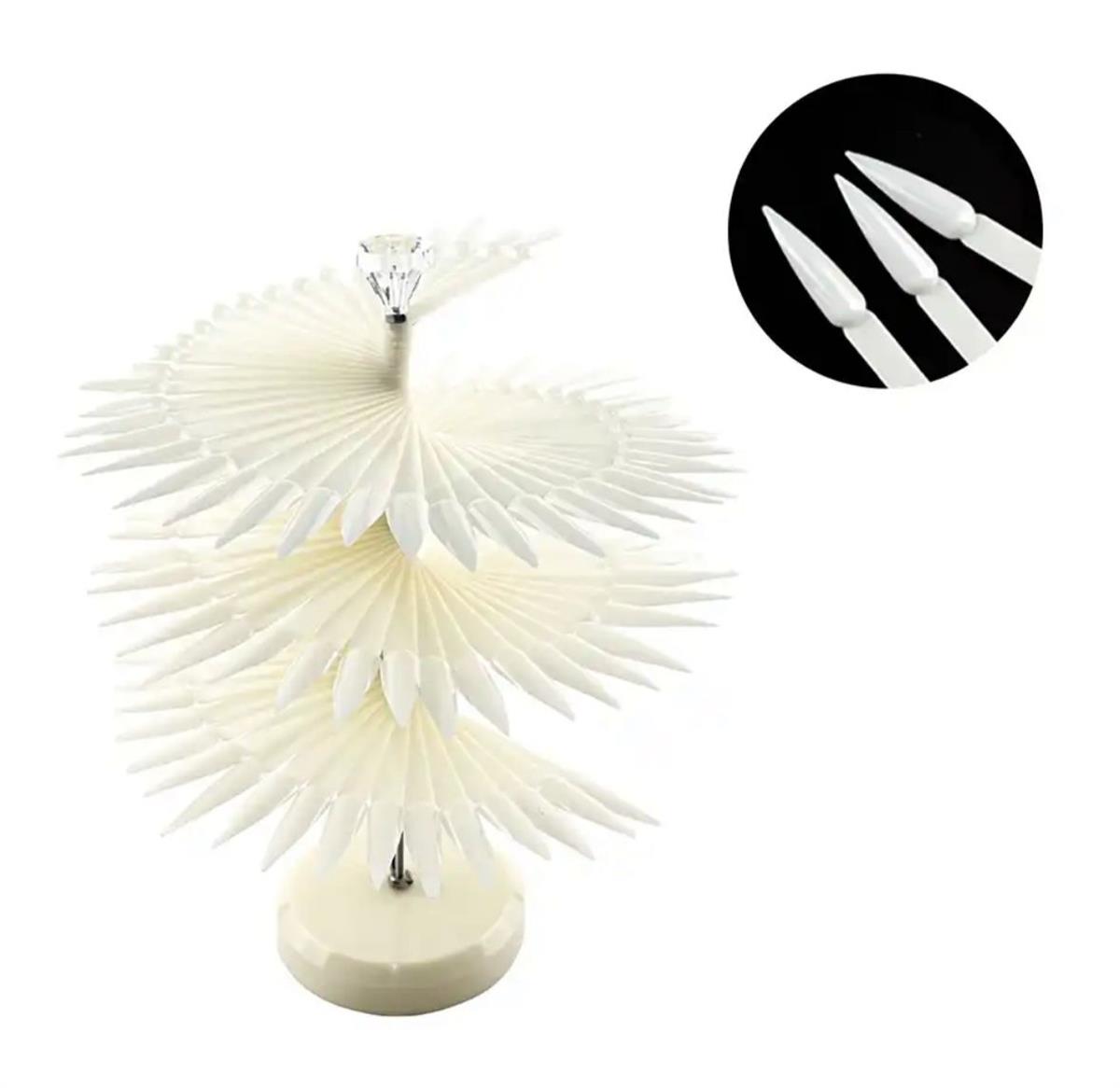 Kemik rengi stiletto tırnak kartelası, 120 farklı rengi veya tasarımı sergilemek için 120 adet tırnak ucu içerir. Ayaklı stand yapısı sayesinde masada veya rafta dekoratif durur. Müşterilerin renk seçimi yapmasını kolaylaştırır. Dayanıklı plastik materyali üzerine uygulama yapmak kolaydır.