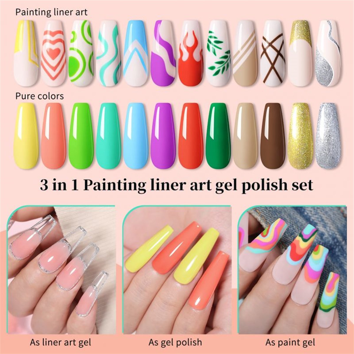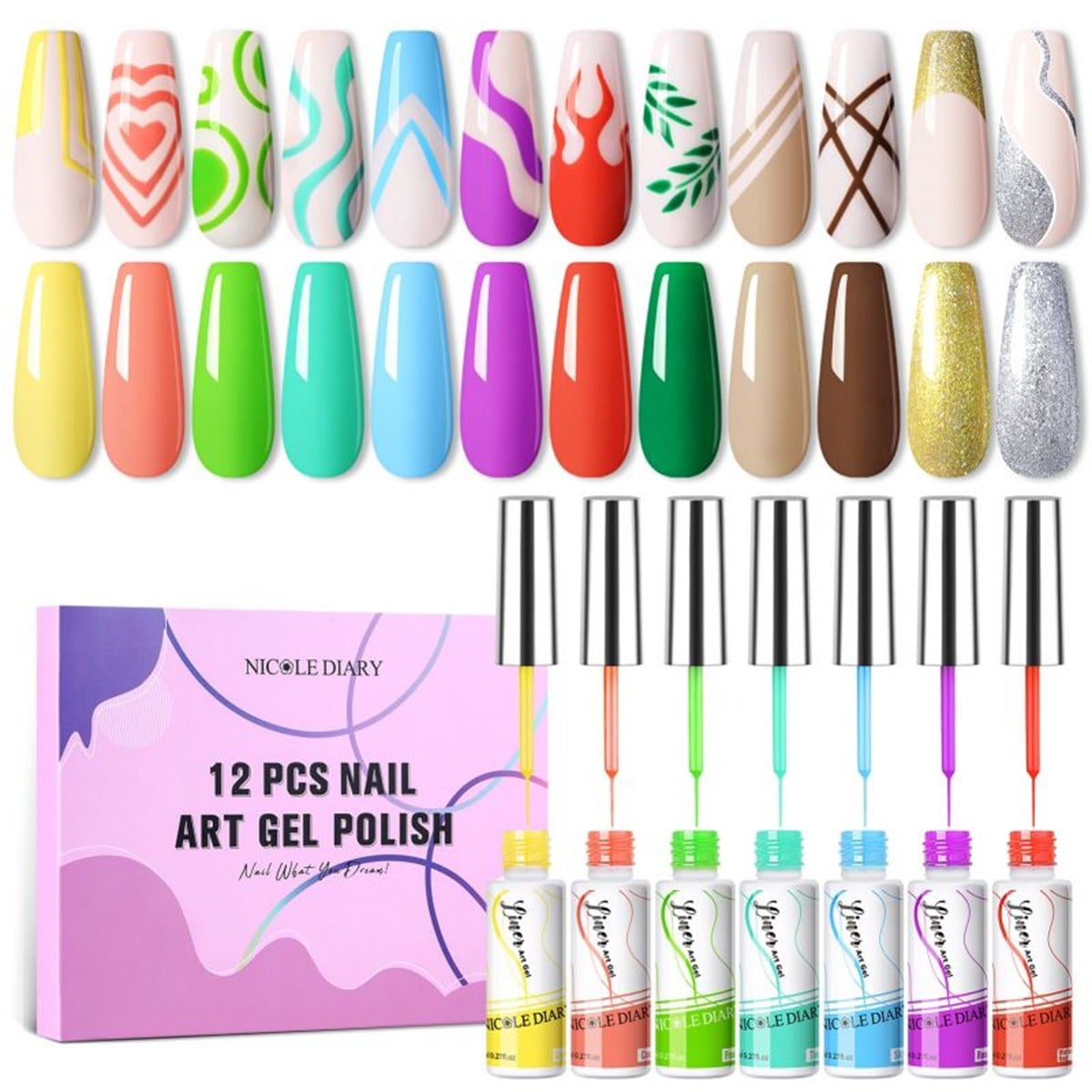 Nicole Diary 12'li Nail Art Dizayn Boya Seti Fırçalı. Yüksek pigmentli 12 farklı renkten oluşan, kendinden fırçalı profesyonel tırnak boyama seti. İnce uçlu fırçaları sayesinde detaylı desenler, çizgiler ve sanatsal çalışmalar için idealdir. UV/LED lamba ile saniyeler içinde kurur ve dağılma yapmaz.